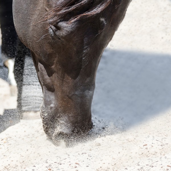 No se puede por completo evitar que los caballos ingieran pequeñas cantidades de arena cuando comen heno del suelo o pastan en el prado. La ingestión de arena es particularmente probable si la hierba del pasto está muy consumida y por lo tanto es más corta . Cantidades más pequeñas de arena se excretan fácilmente de forma natural. Sin embargo, si se acumulan grandes cantidades de arena en el tracto digestivo, la digestión puede verse alterada. Los cólicos y el desplazamiento del colon pueden tener graves consecuencias. Hay signos clínicos que indican una acumulación de “arena intestinal”, que incluye diarrea crónica, heces acuosas y pérdida de peso.