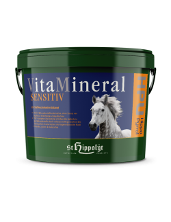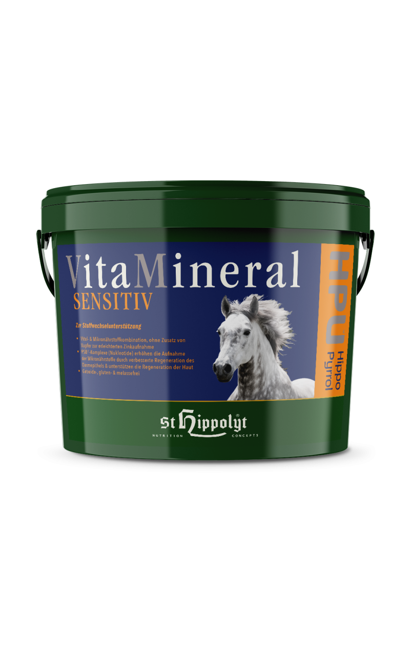 ®(nucleótidos) aportan, además de lecitina y vitaminas del grupo B, grupos de fósforo específicos, que sirven para activar las vitaminas del grupo B y mejorar la absorción de nutrientes vitales y micronutrientes.Debido al empobrecimiento progresivo de oligoelementos en el suelo y, como resultado, también en las hierbas que crecen en él, el contenido de sustancias vitales en la ración de alimento a menudo ya no es suficiente. En comparación con los valores de calidad del heno de hace 100 años, se ha podido demostrar que el contenido de zinc en particular ha disminuido significativamente. Al mismo tiempo, la contaminación ambiental causada por pesticidas, metales pesados y medicamentos está aumentando, lo que supone una carga cada vez mayor para el organismo del caballo. Las consecuencias para el caballo pueden ser muy diversas y pueden manifestarse en problemas de piel y pelaje, bajo rendimiento, problemas en el metabolismo muscular, trastornos en el metabolismo de carbohidratos y proteínas, trastornos del comportamiento, problemas articulares, susceptibilidad a infecciones, falta de motivación, problemas respiratorios y fiebre del barro. Los dos componentes, VitaComplex sensitive, especialmente optimizado para las necesidades diarias, y VitaMineral sensitive, adecuado para una nutrición completa, compensan las deficiencias nutricionales, apoyan el sistema inmunológico y restauran la vitalidad del caballo. Los caballos con piel hipersensible y picazón en particular se benefician de esta combinación única de nutrientes vitales y micronutrientes. Dependiendo del propósito de la alimentación, ambos componentes también pueden utilizarse por separado.