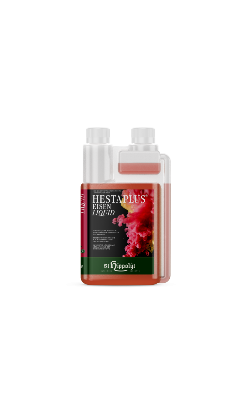 Hesta Plus ® Iron LIQUID se caracteriza por una biodisponibilidad particularmente alta y es adecuado para compensar de forma rápida y fiable una deficiencia de Fe (confirmada mediante un análisis de sangre). Hesta Plus ® Iron LIQUID es adecuado para todo tipo de caballos debido a su baja dosificación.