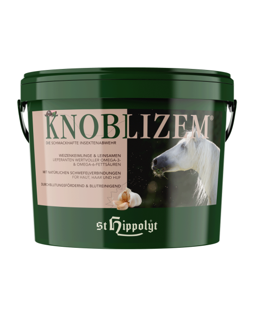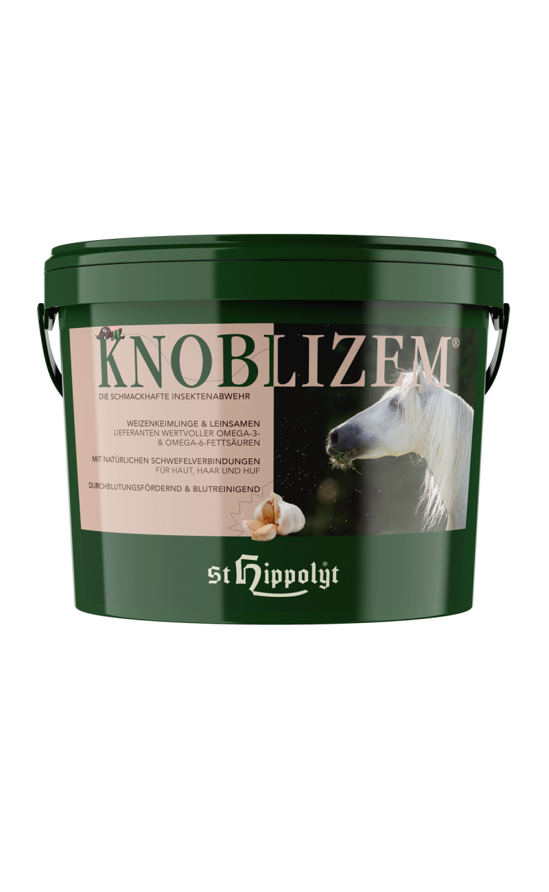 Knoblizem ®, el popular suplemento alimenticio para caballos con problemas de insectos en el pasto, es una eficaz combinación de ajo de primera calidad, hierbas como romero, menta y cilantro, además de vitaminas del complejo B. Knoblizem ®proporciona a los caballos una fuente de ajo equilibrada y ligeramente picante. El germen de trigo y la linaza aportan vitamina E natural, enzimas digestivas y valiosos ácidos grasos esenciales.