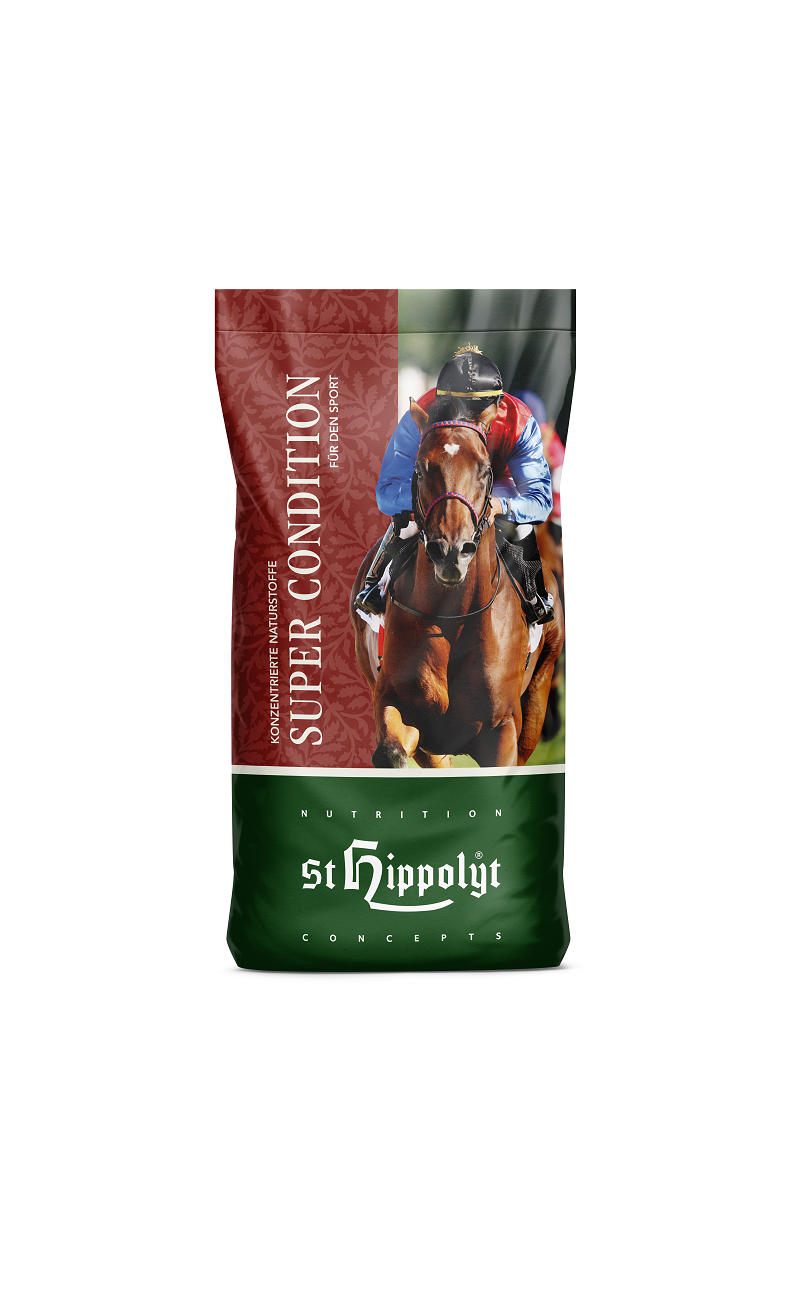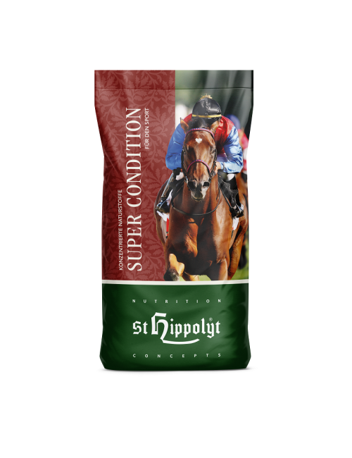Los ingredientes de alta calidad, así como la mineralización y vitaminación específicas en una forma altamente concentrada, permiten alimentar a Super Condition con solo unos pocos cientos de gramos por día. Su eficacia se puede observar en caballos deportivos estresados y en sementales durante la obtención de licencias y la cría. Incluso en el ámbito de ocio, el jinete en excelente forma disfruta de un caballo relajado, trabajador y con una manejabilidad especial.