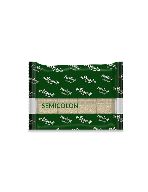 La barrita SemiColon - microbioma intestinal no contiene cereales y tiene un contenido muy bajo en almidón y azúcar, lo que la hace adecuada para todo tipo de caballos.